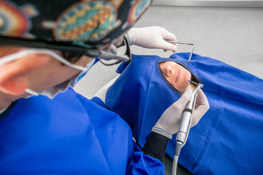 Poseg poteka v lokalni anesteziji – enaki kot pri predhodnem puljenju. Dlesen odmaknemo od kostnine in nato pristopimo skuzi malo luknjico v sinusno votlino, kjer vstavimo umetno kost. Po 4 – 6 mesecih od dograditve je primeren čas za vstavitev zobnega vsadka-implantata.